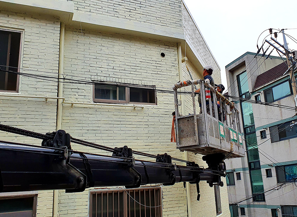 스카이를 타고 적벽돌에 매직탄을 바르는 작업