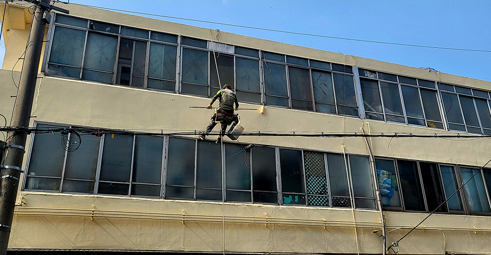 밧줄을 타고 갈라진 벽면의 틈이나 창틀을 빠데와 실리콘으로 시공으로 시공하는 작업